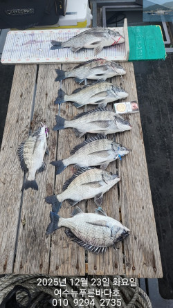 *안녕하세요..뉴푸른바다호 입니다*#감성돔 #감성돔출조 #감성돔선상 #점주조황 #선상찌흘림 #솔직한 조황12월23일 감성돔 조황 입니다.9분의 조사님들 모시고 출조 댕겨 왔습니다.오늘은 힘든 낚시하고왔네요.입질이 예민해서 그런지 물것 같으면서도 안물은건 . . .그와중에 두방 터져불고요. .채비 점검 하세요. ..함께 해주신 조사님들수고 많으셨습니다.토요일 감성돔 출조 합니다.현재 5분 예약중5자리 여유 있습니다.(무조건 나갑니다)☆일요일 3자리 여유있습니다맛있는 감생이 잡으러 같이 가보시게요.*선비:12만원(밑밥.미끼.식사 포함)*선사제공(생수.음료수.컵라면.커피.스낵류)쿡 쿡 쳐박는 짜릿한 손맛 보러 오세요.감성돔은 쭈~~~욱 출조 합니다.*출조시간은 전날 오후에 문자 드립니다(문자 확인 꼭 꼭 부탁드립니다)함께 하실 조사님들 문자또는 전화 주세요.010. 9294. 2735로 콜~~☆선상 24로 예약 하러가기https://blueocean.sunsang24.com/*** 여수 뉴푸른바다호 예약 안내 ***예약문의 : 010-9294-2735오시는길 : 전남 여수시 어항단지로 18 (소경도대합실 앞 방파제 끝쪽 좌측)홈페이지 : https://blueocean.sunsang24.com/